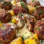 Indulge in the warm embrace of home-cooked goodness with every bite of Cheesy Mozzarella Stuffed Meatballs Skillet. Picture this: succulent meatballs, meticulously crafted from the finest ground beef, cradle luscious, gooey mozzarella, ready to erupt with flavor at the slightest touch. As these golden-brown orbs simmer in a dreamy, creamy garlic sauce, infused with robust Parmesan and fragrant garlic, they weave an intoxicating aroma that dances through your kitchen. The fire-kissed edges of the meatballs blend seamlessly with the tender baby potatoes, creating a medley of textures that invites you to dive in. Each mouthful delivers a symphony of flavors—savory, cheesy, and heartwarming, reminiscent of cozy family dinners and laughter echoing around the table.