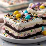 A delightful, creamy dessert layered with crushed Oreos, cream cheese, and topped with festive mini eggs and sprinkles.