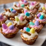 Delightful mini cupcakes topped with pink frosting, white chocolate pretzels, and candy-coated eggs, perfect for Easter celebrations.