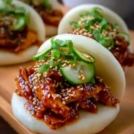 The flavors are intense yet balanced—the sweet and smoky Korean barbecue sauce pairs beautifully with the soft bao buns, and the toppings of green onions and sesame seeds add that extra crunch and freshness.