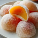 A delightful summer treat, peach mochi features a chewy exterior filled with fresh peaches and fluffy whipped cream.