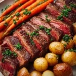This Perfectly Sliced Steak with Roasted Baby Potatoes and Carrots is a straightforward weeknight dinner: roast the potatoes and carrots at 400°F, sear ribeyes 4–5 minutes per side for medium-rare, rest, then slice and serve. Quick, flavorful, and reliably satisfying.