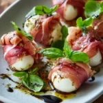 A delightful and elegant appetizer featuring creamy mozzarella wrapped in savory prosciutto, enhanced with fresh basil and a sweet drizzle of balsamic glaze.