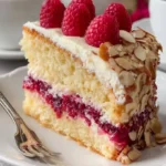 A delightful Raspberry Vanilla Crunch Cake with layers of fluffy cake, sweet raspberry filling, and creamy frosting topped with toasted almonds.