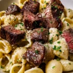 - “Deliciously Easy Steak Bites and Shell Pasta in Garlic Butter Alfredo Sauce”