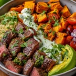 This Steak & Sweet Potato Power Bowl isn’t just a meal; it’s an experience. It combines the hearty goodness of steak and sweet potatoes with fresh, crunchy veggies and a zesty lime crema.