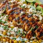 A delightful chicken rice bowl inspired by Mexican street corn, featuring grilled chicken, creamy corn salad, and fluffy rice.