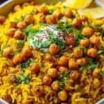 A vibrant and comforting dish of basmati rice infused with turmeric, creamy chickpeas, and fresh herbs, perfect for any occasion.